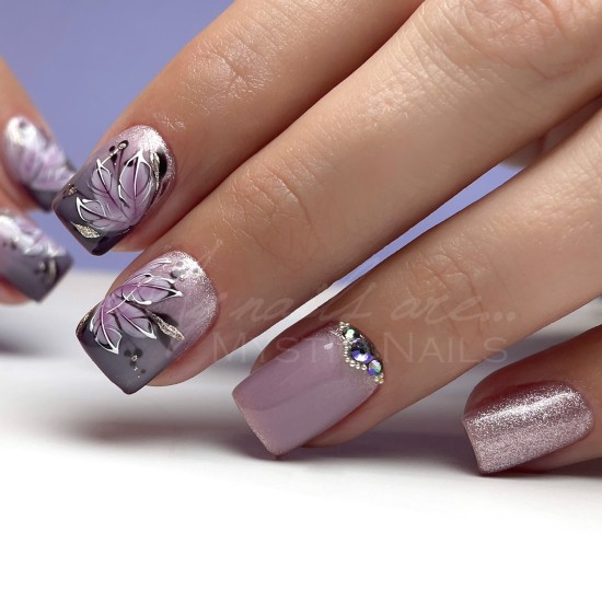 F. Vigyünk fel egy vékony réteget a kiválasztott, jól pigmentált Mystic Nails gél lakk színből, majd köttessük meg UV (2perc) vagy LED (1 perc) lámpában
