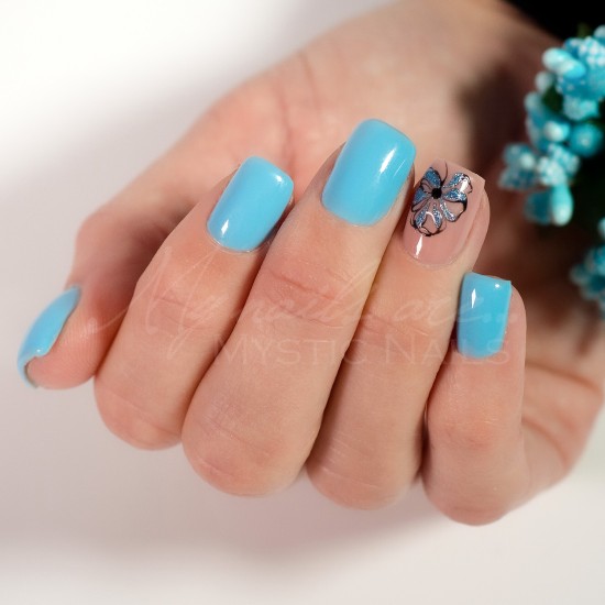 D. Vigyünk fel egy vékony réteget a kiválasztott, jól pigmentált Mystic Nails gél lakk színből, majd köttessük meg UV (2perc) vagy LED (1 perc) lámpában